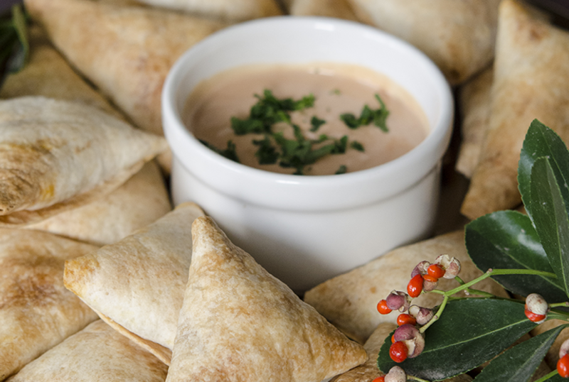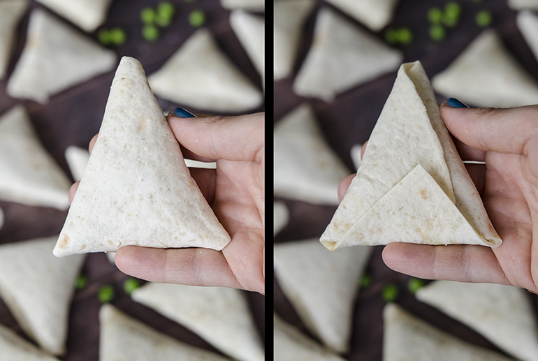 Pripremiti tortilje, podeliti ih na četvrtine. Svaku četvrtinu umotati kao u videu, ulepiti mešavinom brašna i vode, napuniti krompir filom. Umotane samose ređati na pleh i peći u zagrejanoj rerni na 180C oko 20min, odnosno dok ne porumene. Poslednjih 5 minuta pečenja možete uključiti i ventilator.